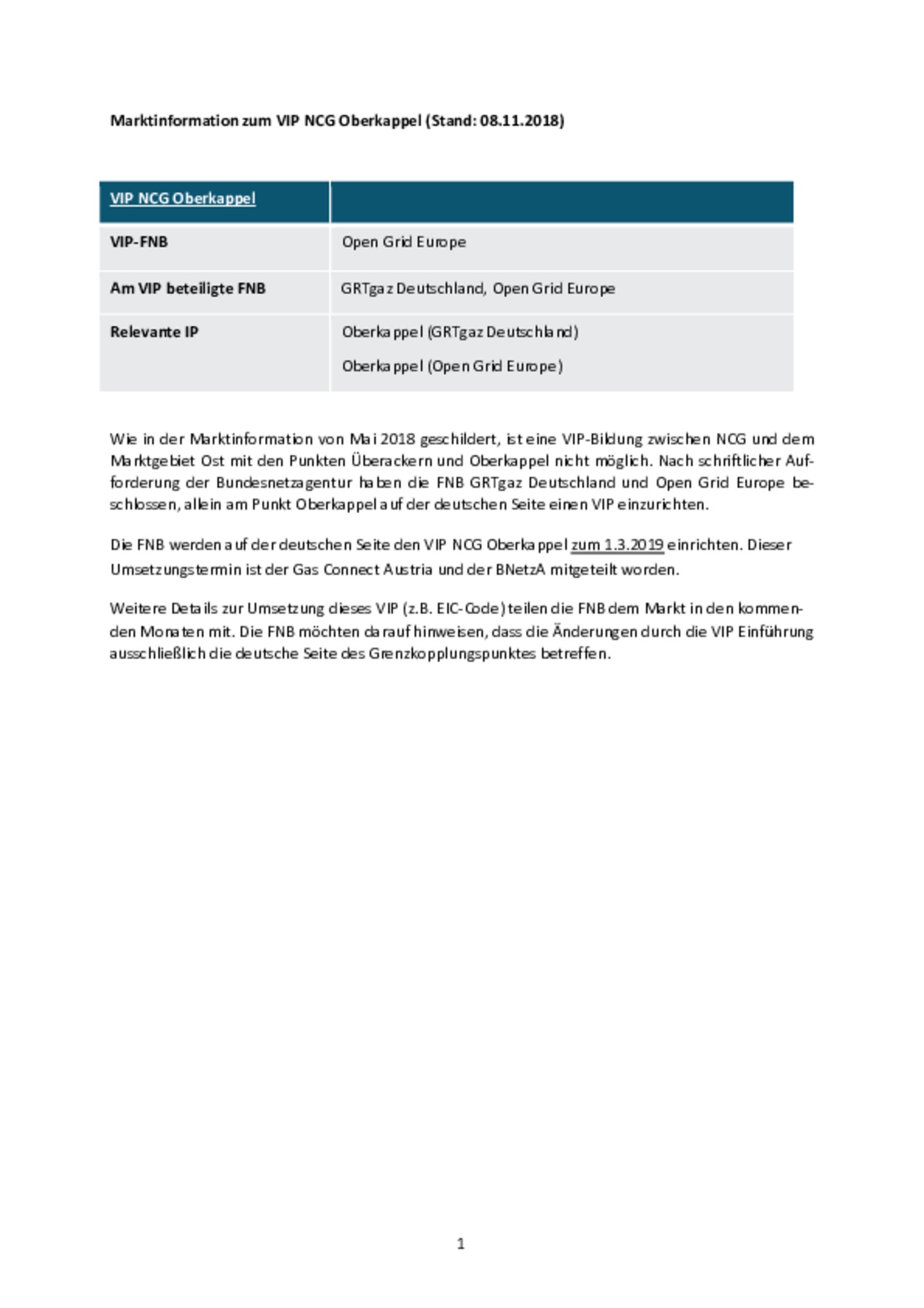 Die FNB haben auf der deutschen Seite den VIP NCG Oberkappel zum 1.3.2019 eingerichtet. Dieser Umsetzungstermin ist der Gas Connect Austria und der BNetzA mitgeteilt worden.