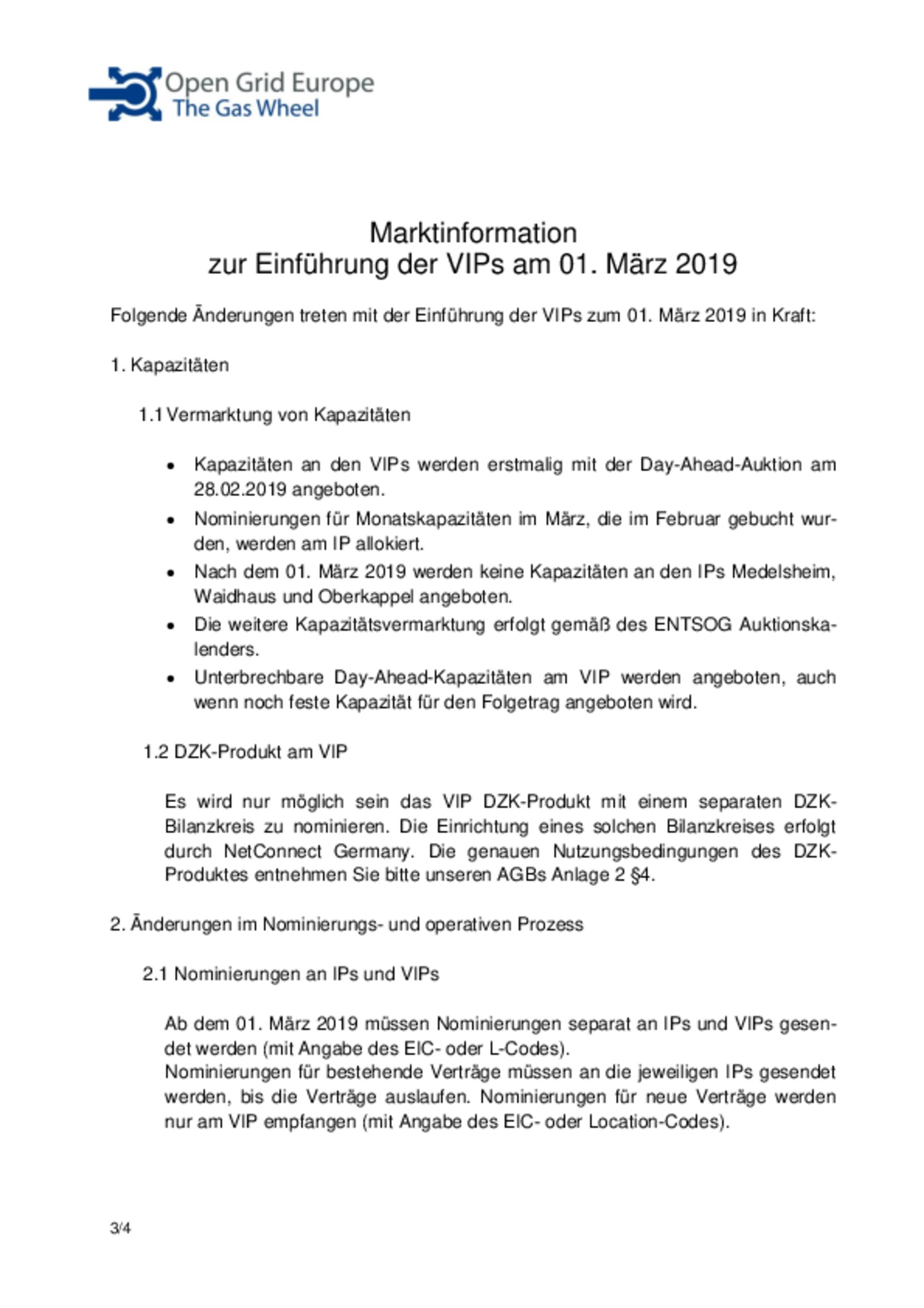 An den oben genannten IPs wird die Kapazitätsvermarktung aufgrund der Einführung der VIPs zwischen den Niederlanden und NCG ab dem Gastag 01.04.2020 eingestellt. Die letzten Kapazitätsauktionen an diesen IPs werden die Day-Ahead-Auktion und die Within-Day-Auktionen am 30./31.03.2020 für den 31.03.2020 sein. Bestehende Verträge an den oben genannten IPs werden dort unverändert verbleiben. Für Transportzeiträume ab dem Gastag 01.04.2020, 6 Uhr, werden alle Kapazitätsverträge nur noch an den entsprechenden VIPs abgeschlossen.