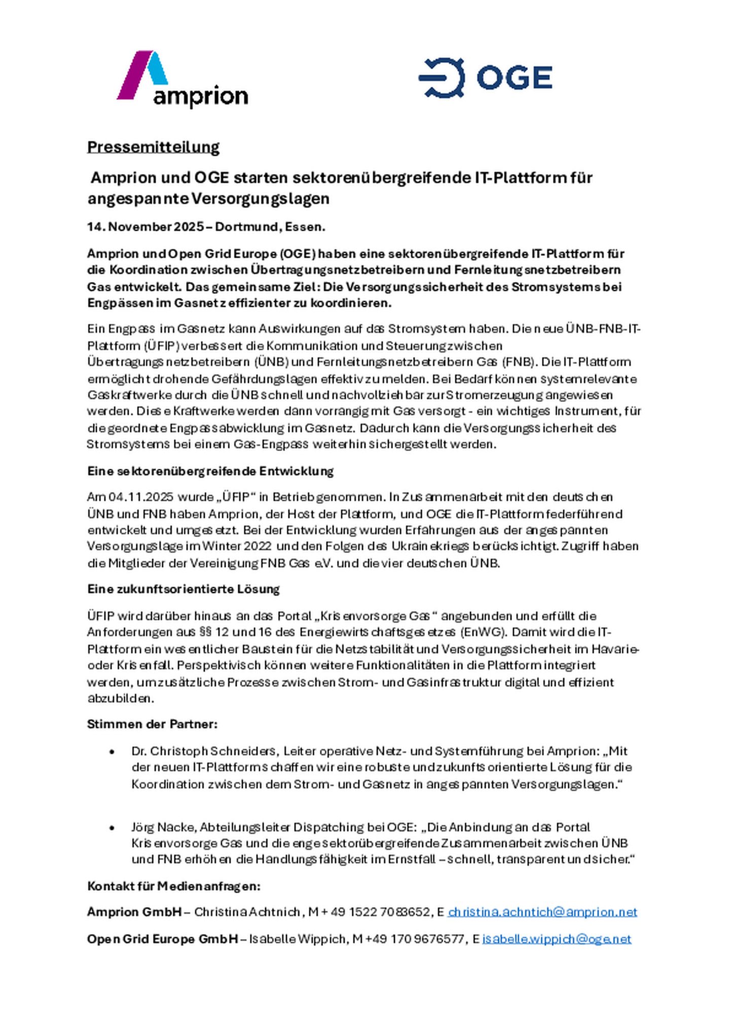 Amprion und OGE starten sektorenübergreifende IT-Plattform für angespannte Versorgungslagen