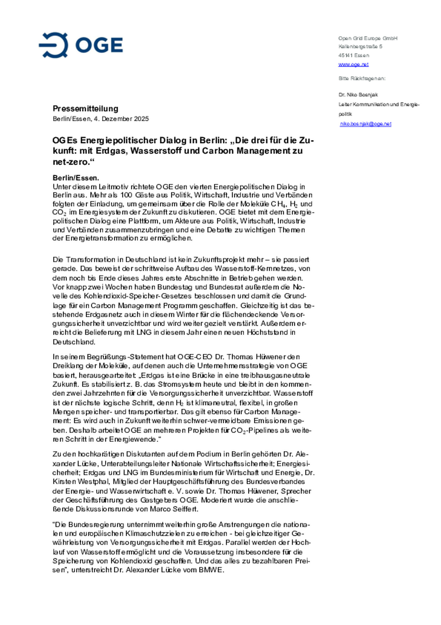 OGEs Energiepolitischer Dialog in Berlin: „Die drei für die Zukunft: mit Erdgas, Wasserstoff und Carbon Management zu net-zero.“