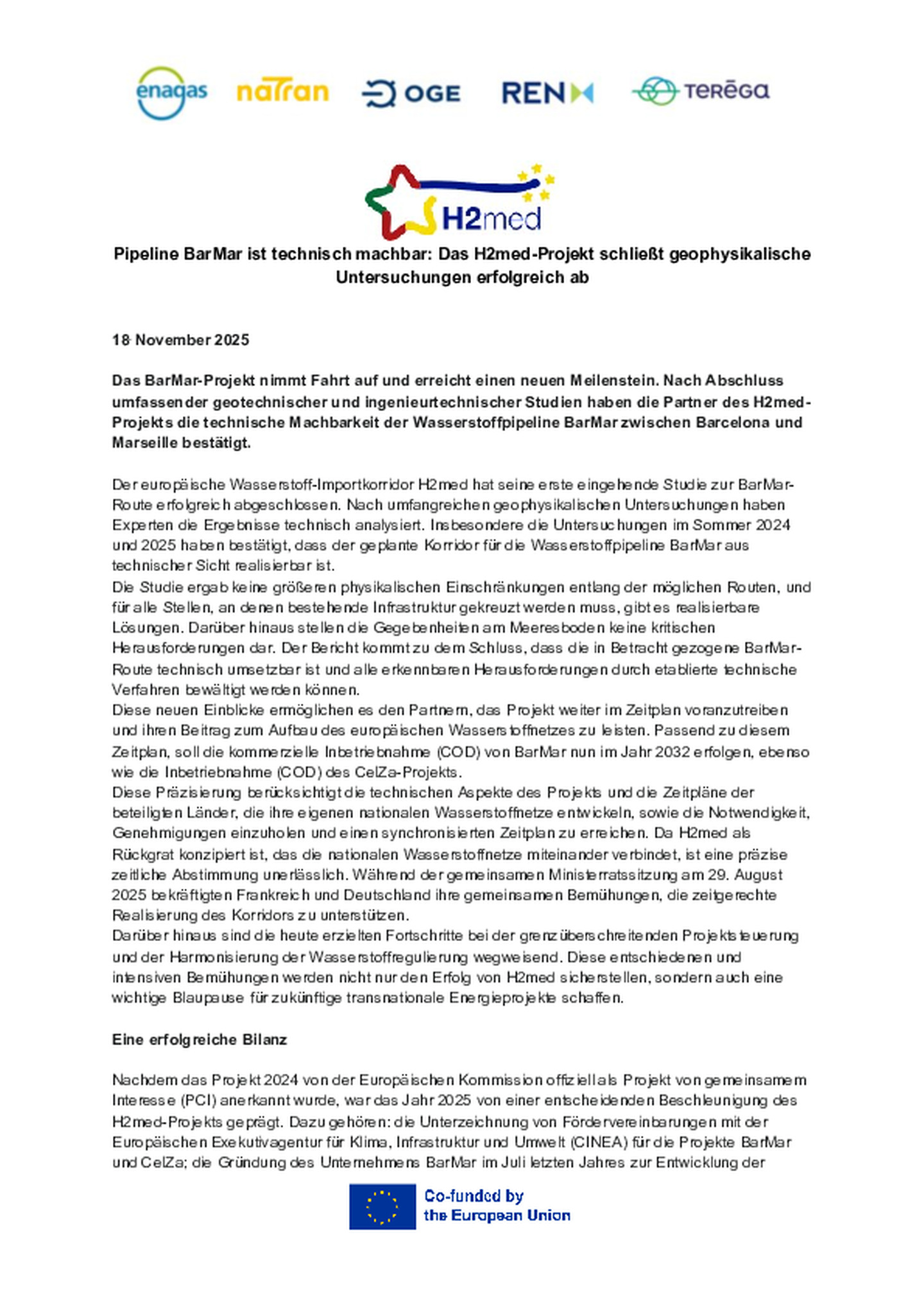 Pipeline BarMar ist technisch machbar: Das H2med-Projekt schließt geophysikalische Untersuchungen erfolgreich ab
