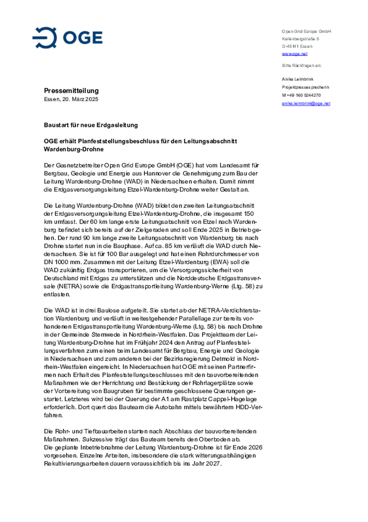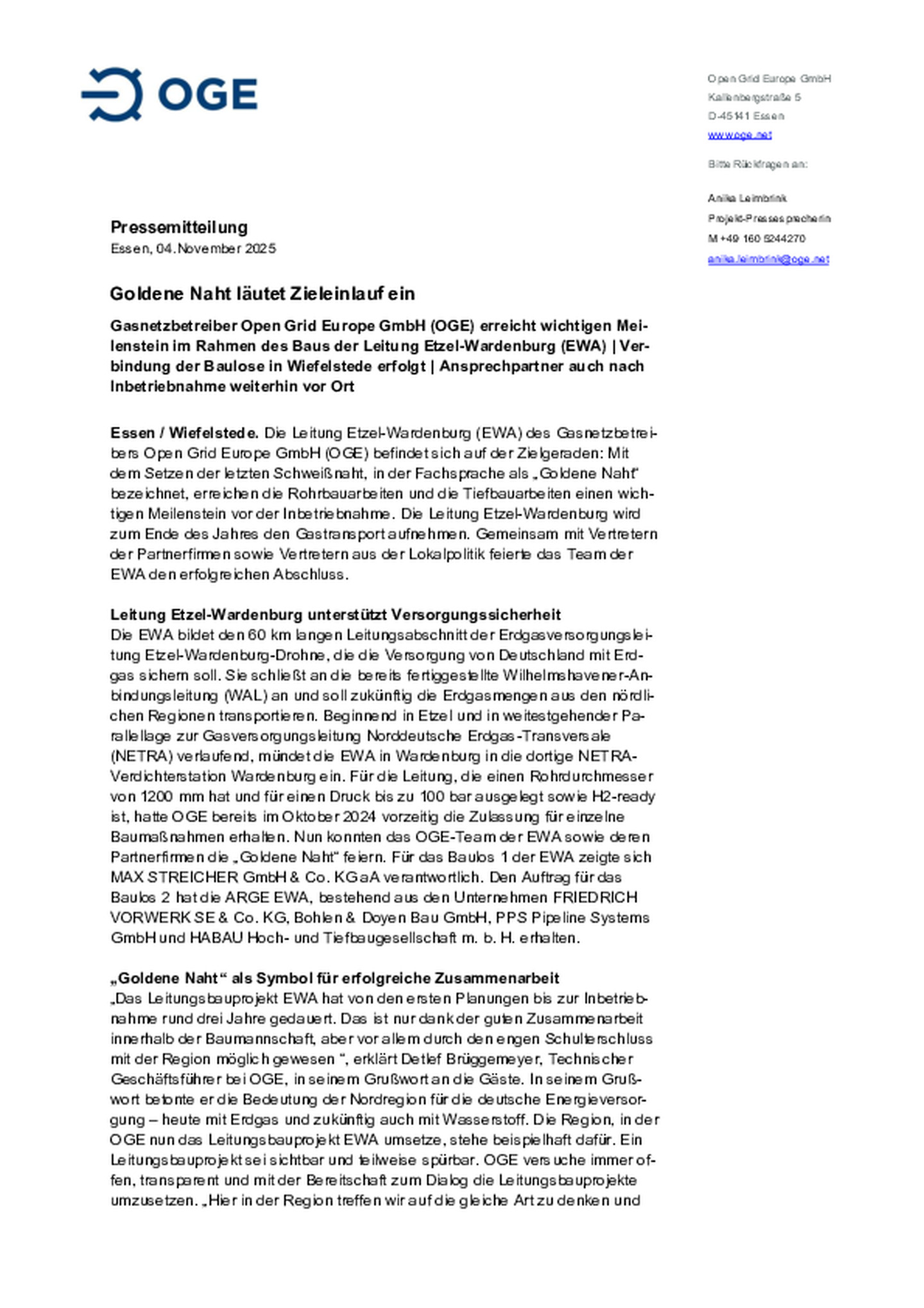 Gasnetzbetreiber Open Grid Europe GmbH (OGE) erreicht wichtigen Meilenstein im Rahmen des Baus der Leitung Etzel-Wardenburg (EWA). Verbindung der Baulose in Wiefelstede erfolgt. Ansprechpartner auch …nach Inbetriebnahme weiterhin vor Ort.