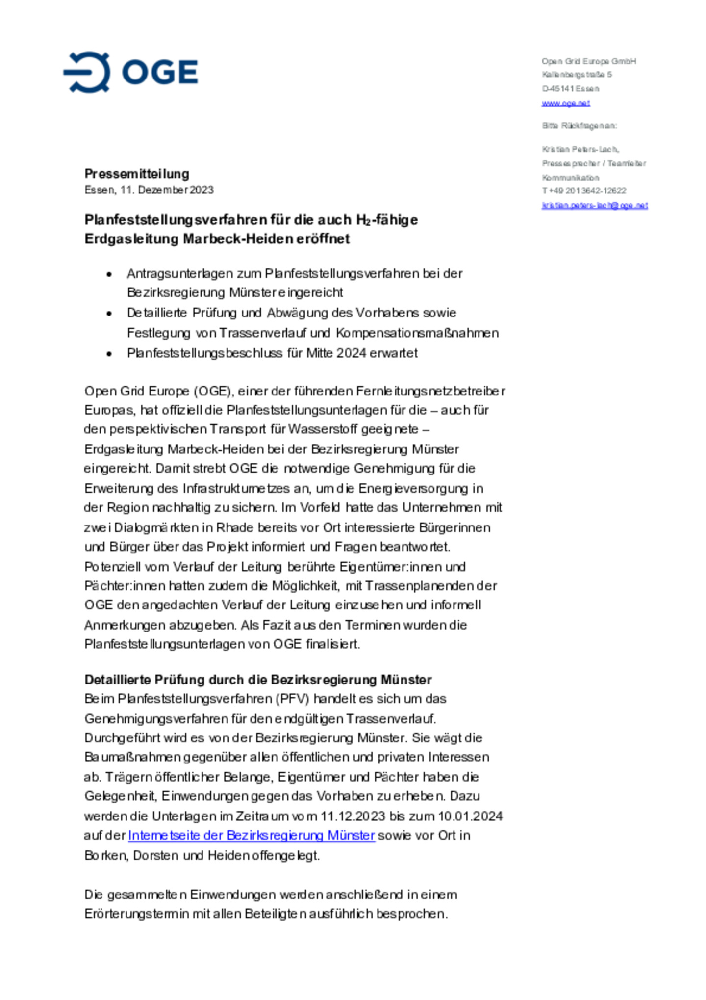 OGE hat offiziell die Planfeststellungsunterlagen für die – auch für den perspektivischen Transport für Wasserstoff geeignete – Erdgasleitung Marbeck-Heiden bei der Bezirksregierung Münster …eingereicht.