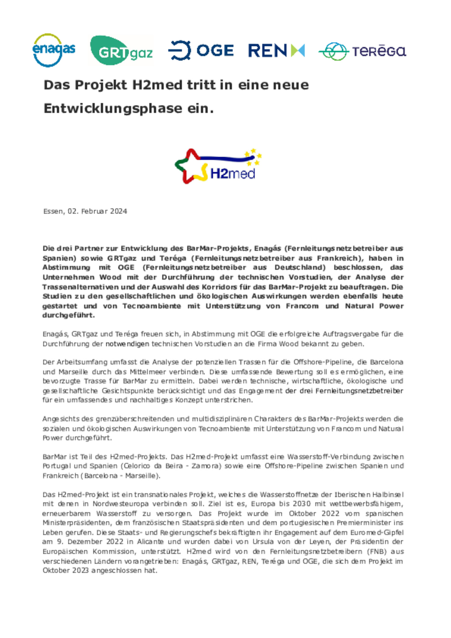 Die drei Entwicklungspartner des BarMar-Projekts, Enagás sowie GRTgaz und Teréga, haben in Abstimmung mit OGE beschlossen, das Unternehmen Wood mit der Durchführung der technischen Vorstudien, der …Analyse der Trassenalternativen und der Auswahl des Korridors für das BarMar-Projekt zu beauftragen.