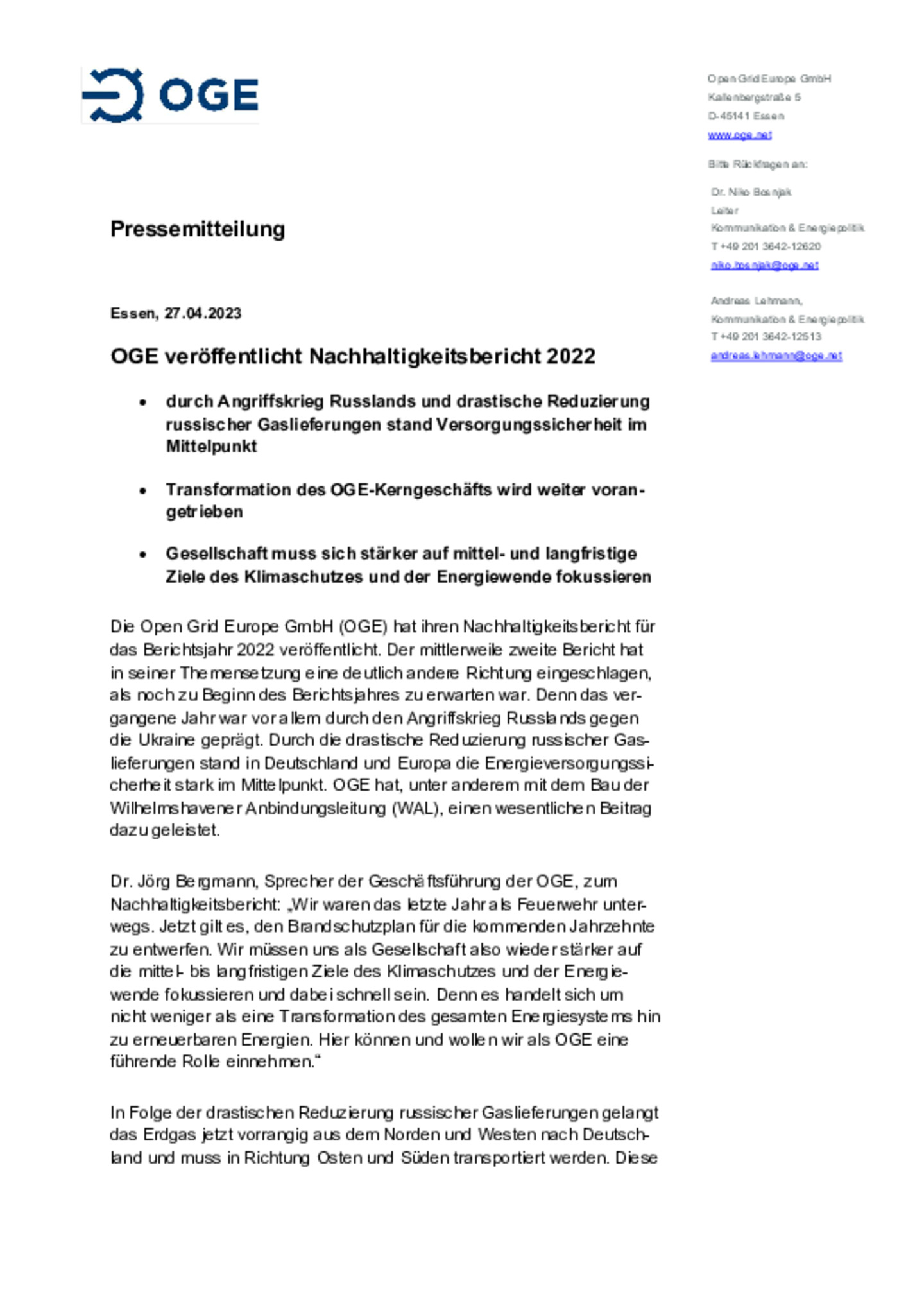 Durch den Angriffskrieg Russlands und drastische Reduzierung russischer Gaslieferungen stand die Versorgungssicherheit im Mittelpunkt. Die Transformation des OGE-Kerngeschäfts wird weiter vorangetrieben. Die Gesellschaft muss sich stärker auf mittel- und langfristige Ziele des Klimaschutzes und der Energiewende fokussieren.