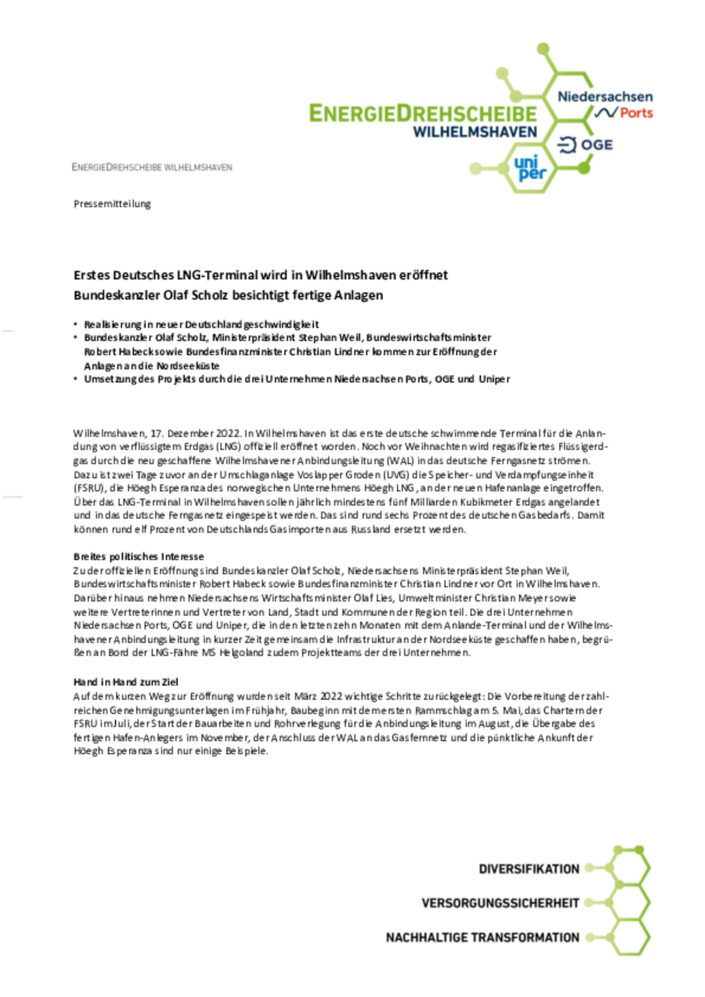 Realisierung in neuer Deutschlandgeschwindigkeit. Bundeskanzler Olaf Scholz, Ministerpräsident Stephan Weil, Bundeswirtschaftsminister Robert Habeck sowie Bundesfinanzminister Christian Lindner kommen zur Eröffnung der Anlagen an die Nordseeküste. Umsetzung des Projekts durch die drei Unternehmen Niedersachsen Ports, OGE und Uniper.