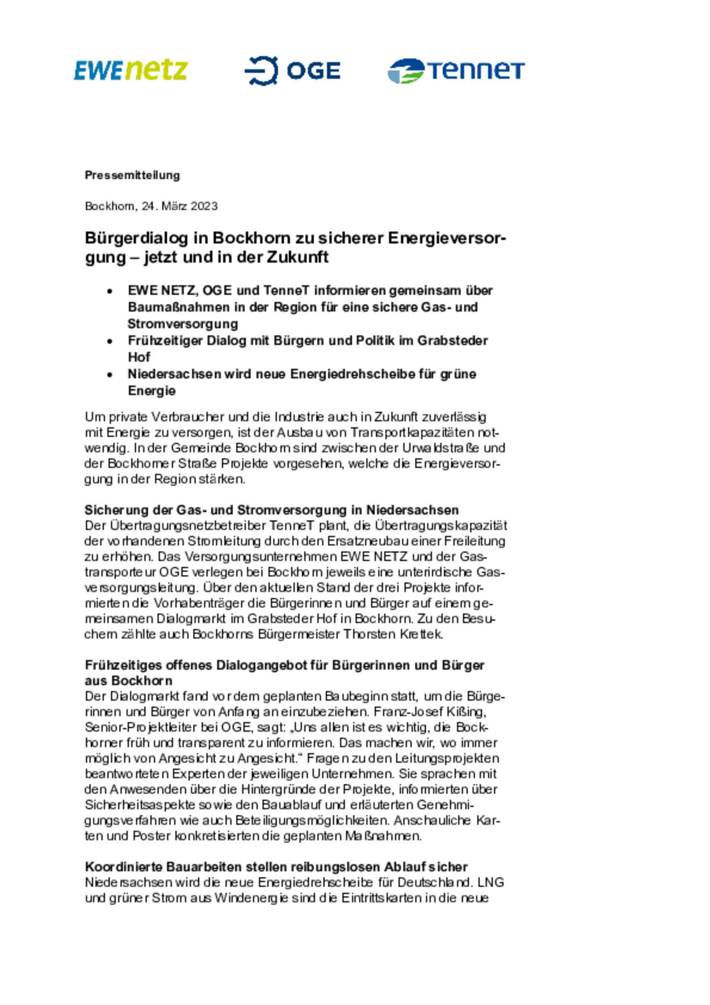 EWE NETZ, OGE und TenneT informieren gemeinsam über Baumaßnahmen in der Region für eine sichere Gas- und Stromversorgung.
