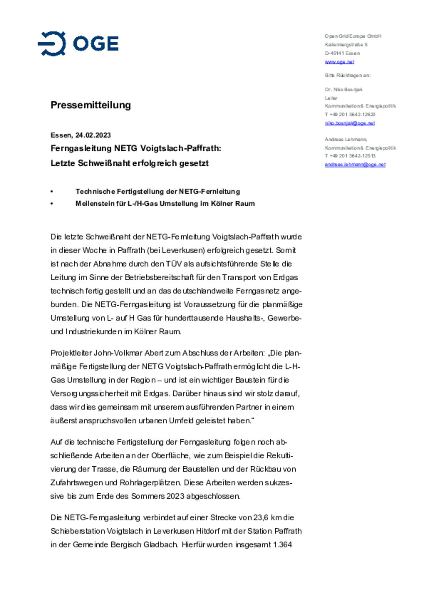 Die letzte Schweißnaht der NETG-Fernleitung Voigtslach-Paffrath wurde in dieser Woche in Paffrath (bei Leverkusen) erfolgreich gesetzt. Somit ist nach der Abnahme durch den TÜV als aufsichtsführende Stelle die Leitung im Sinne der Betriebsbereitschaft für den Transport von Erdgas technisch fertig gestellt und an das deutschlandweite Ferngasnetz angebunden.