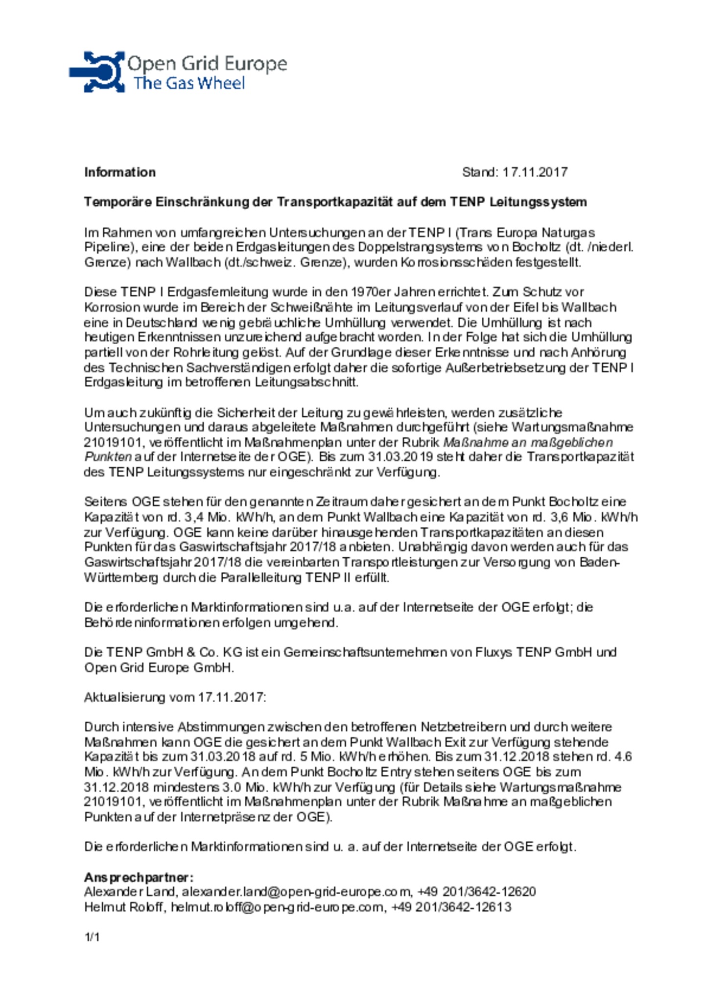 Temporäre Einschränkung der Transportkapazität auf dem TENP Leitungssystem Kategorie: Marktinformation