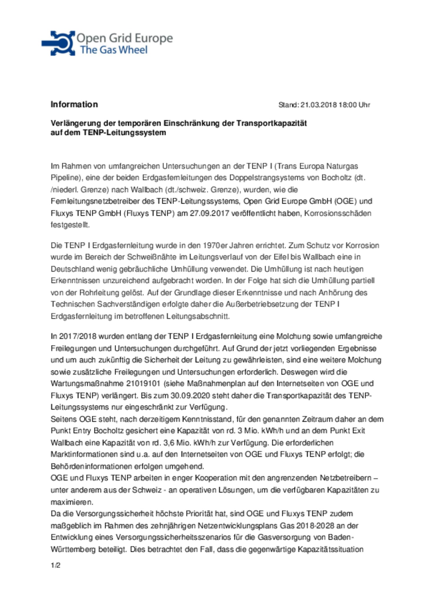 Information zum TENP Stand 21.03.2018