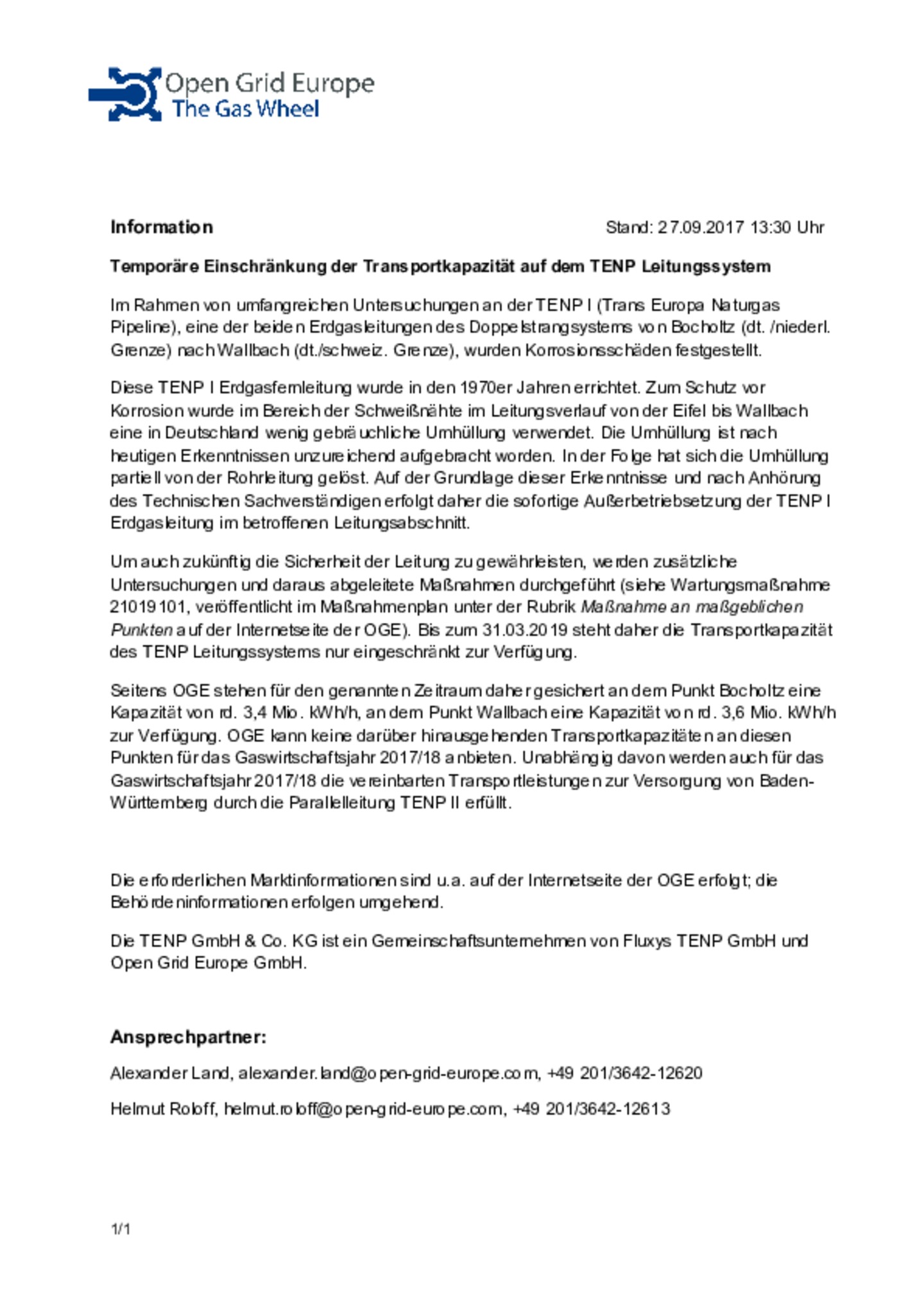 Information zum TENP Stand 27.09.2017