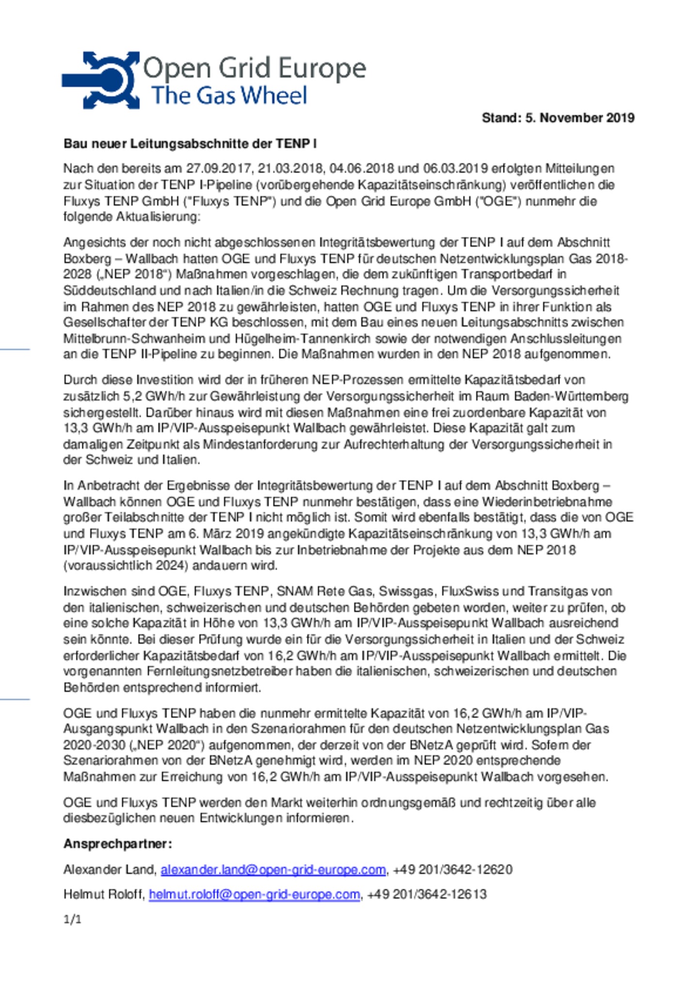 Information zum TENP Stand 05.11.2019