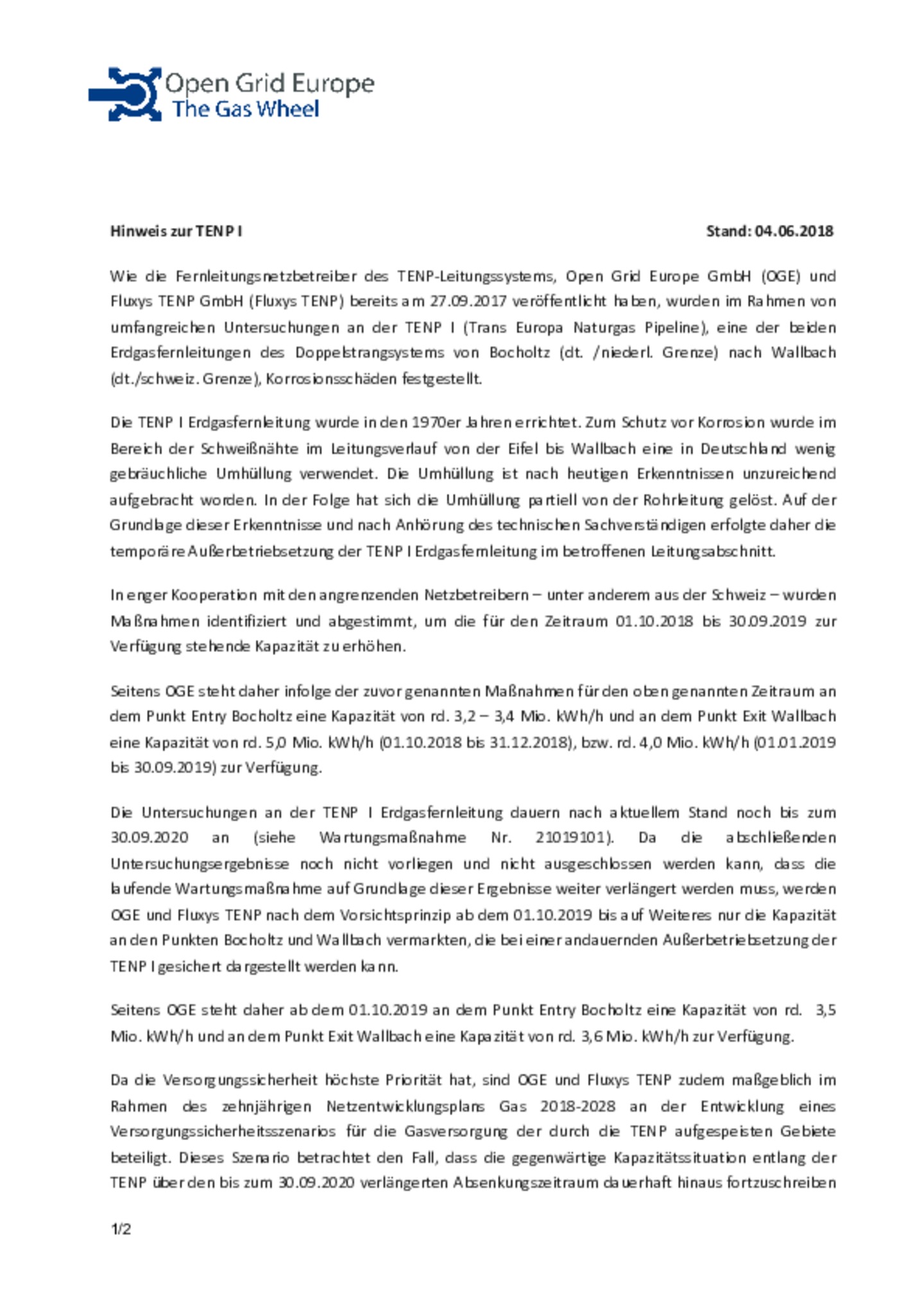 Ergänzung zum am 28.09.2018 veröffentlichten Preisblatt der Open Grid Europe GmbH für Ein- und Ausspeiseverträge sowie interne Bestellungen gem. Kooperationsvereinbarung X im Marktgebiet der NetConnect Germany GmbH & Co. KG (Preisblatt 2019)