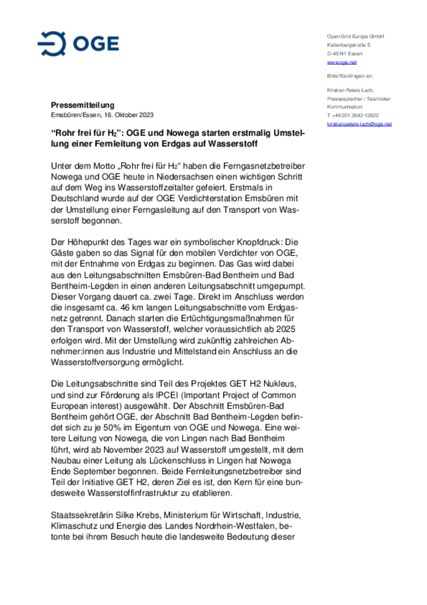 “Rohr frei für H2”: OGE und Nowega starten erstmalig Umstellung einer Fernleitung von Erdgas auf Wasserstoff