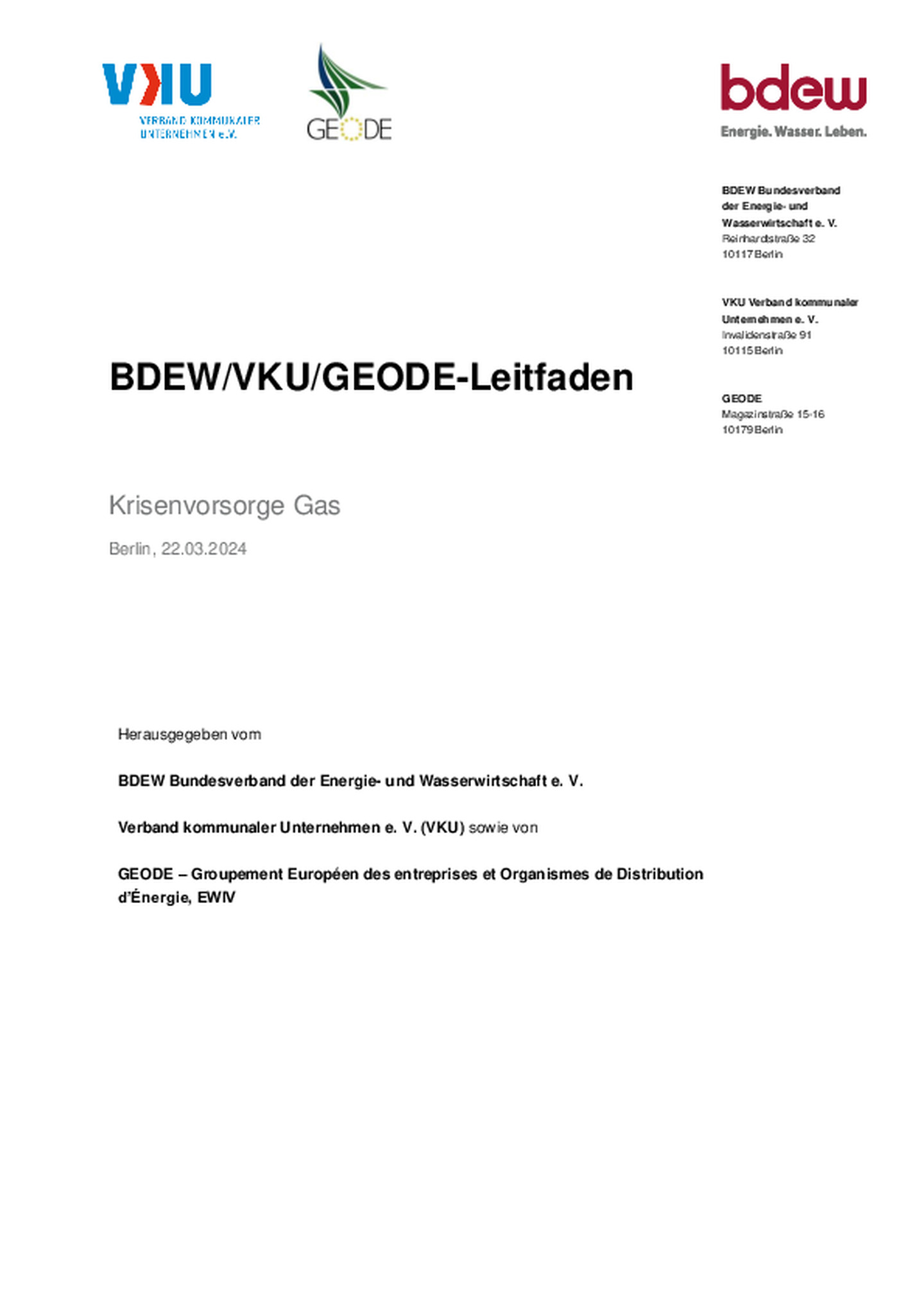 The BDEW/VKU/GEODE-guide „Krisenvorsorge Gas“ mainly describes process flows and related information obligations and communication channels, with the aim being optimal implementation of measures pursuant to Sections 16 and 16a of the German Energy Industry Act (EnWG), in particular between upstream and downstream networks. The guide sets out the requirements of Section 21, “System responsibility under the agreement on cooperation between operators of gas supply networks located in Germany (KoV)”, in concrete terms, describing how they should be implemented across all network levels.
