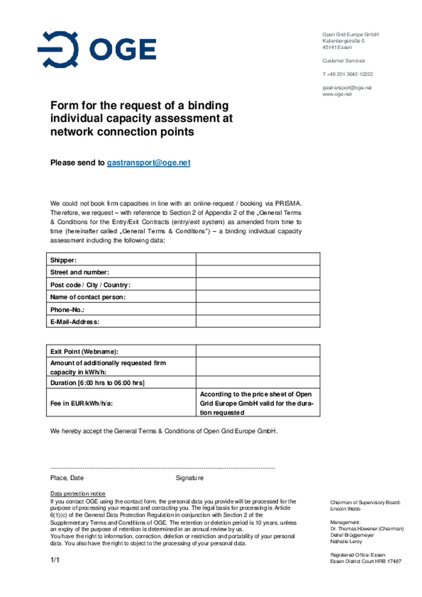 We could not book firm capacities in line with an online-request / booking via PRISMA. Therefore, we request – with reference to Section 2 of Appendix 2 of the „General Terms & Conditions for the …Entry/Exit Contracts (entry/exit system) as amended from time to time (hereinafter called „General Terms & Conditions“) – a binding individual capacity assessment including the following data