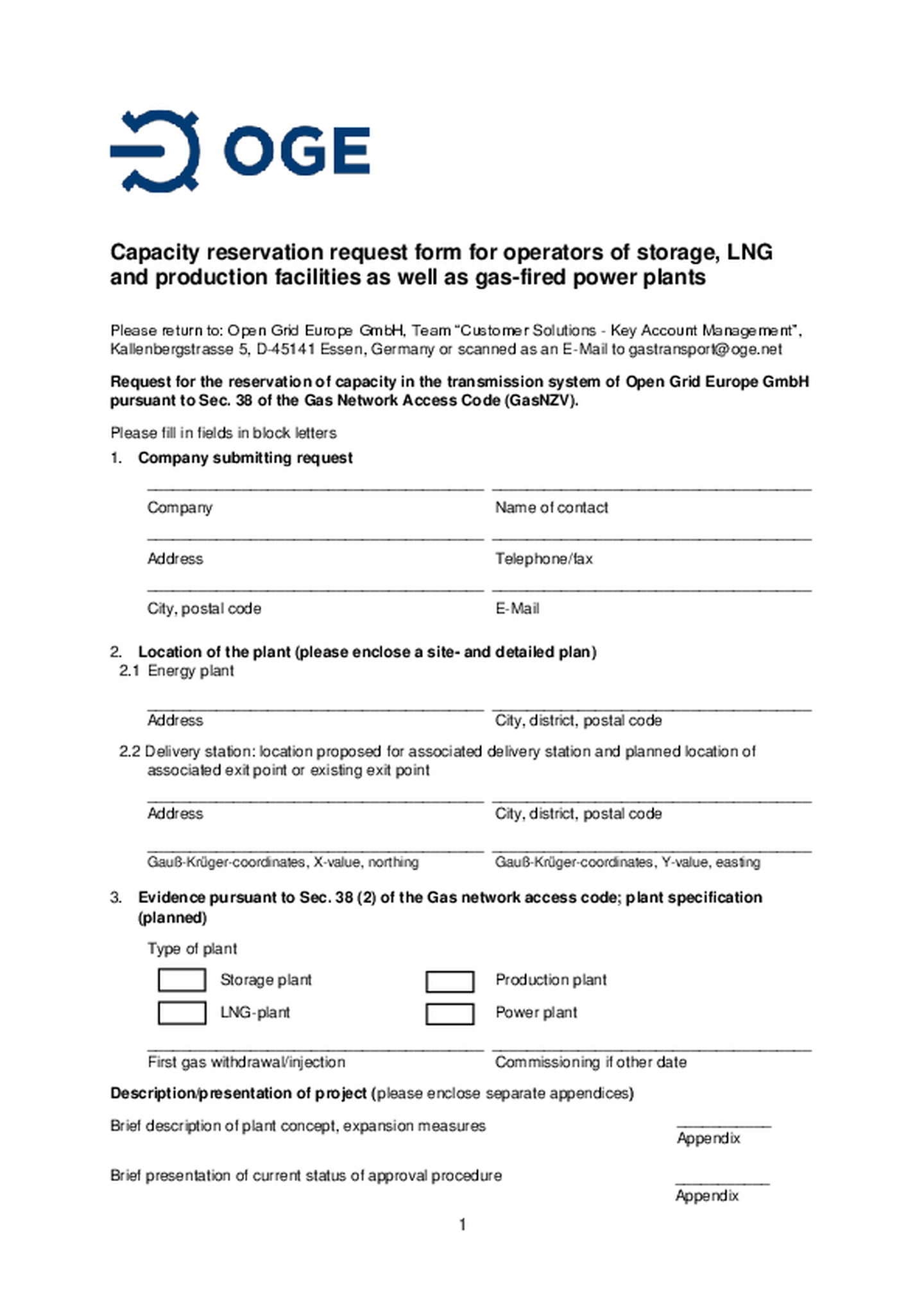 Open Grid Europe offers its shippers a form for the efficient handling of enquiries pursuant to Section 38 GasNZV. The use of the form is intended to ensure that Open Grid Europe promptly obtains all… information required to process your enquiry efficiently.
