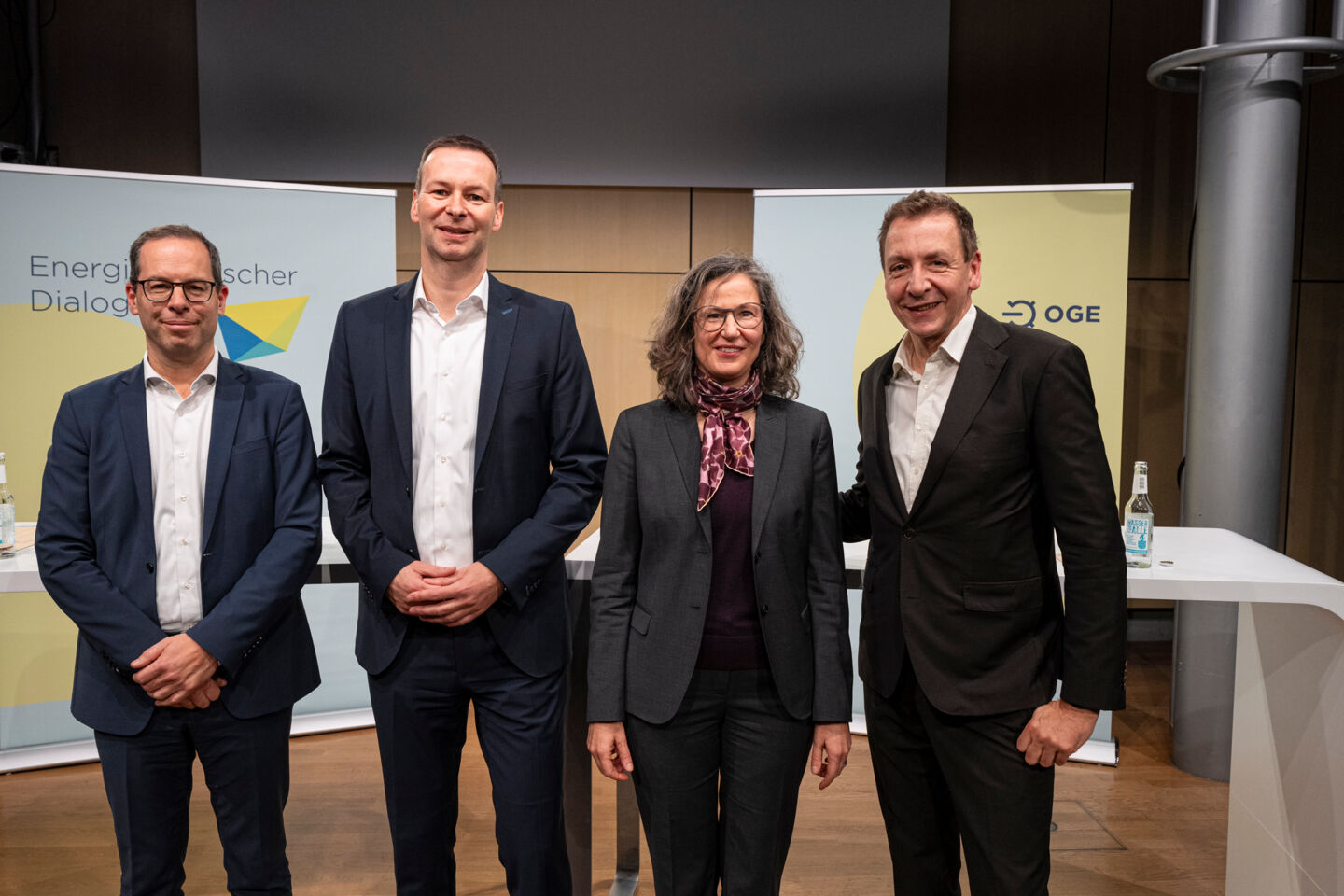 OGE Energy Policy Dialogue in Berlin: “Three pillars for the future: getting to net zero with natural gas, hydrogen and carbon management.” High-profile protagonists for the three molecules CH4, H2, and CO2 – At OGE's fourth Energy Policy Dialogue in Berlin, the following panelists took part in the discussion: from left Dr. Alexander Lücke (Federal Ministry for Economic Affairs and Energy), Dr. Thomas Hüwener (CEO at OGE), Dr. Kirsten Westphal (BDEW German Association of Energy and Water Industries) and host Marco Seiffert.