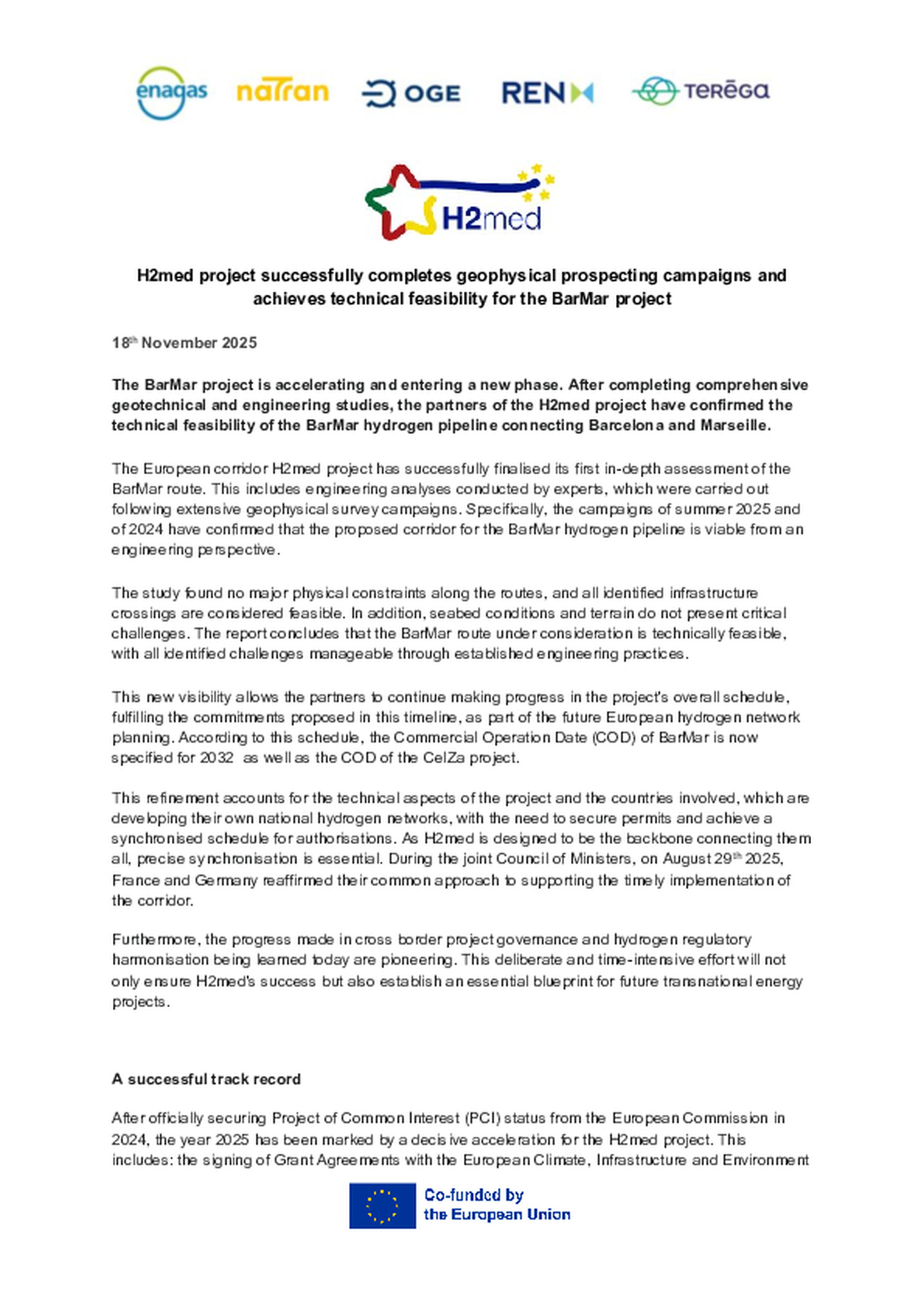 The BarMar project is accelerating and entering a new phase. After completing comprehensive geotechnical and engineering studies, the partners of the H2med project have confirmed the technical feasibility of the BarMar hydrogen pipeline connecting Barcelona and Marseille.