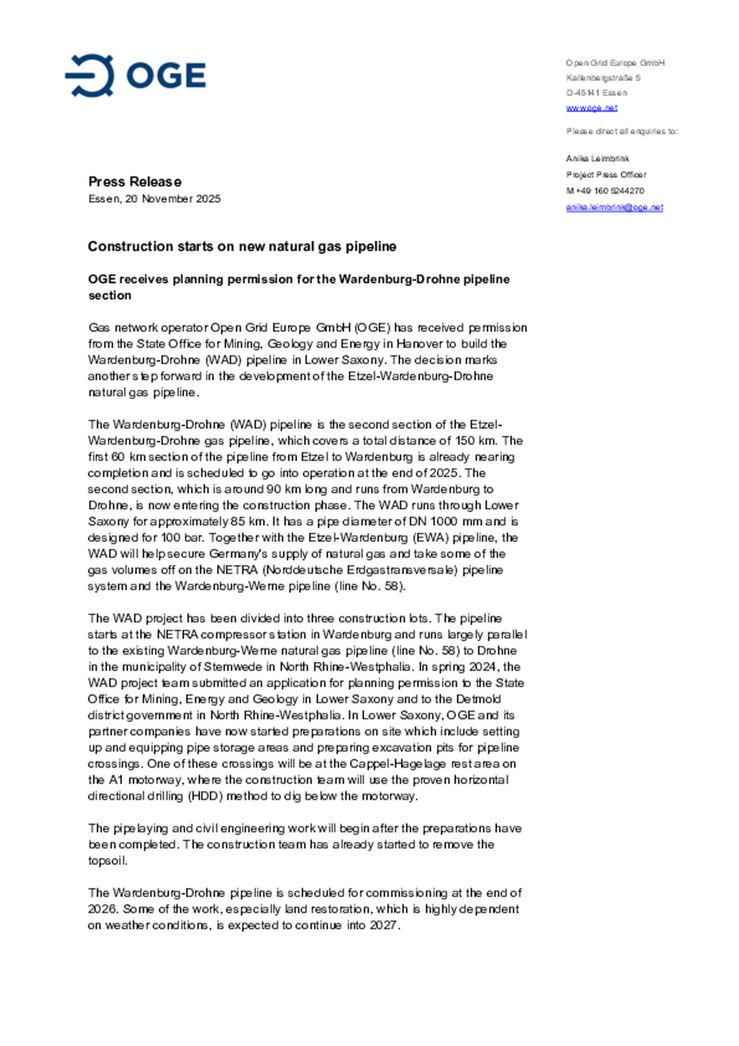 OGE receives planning permission for the Wardenburg-Drohne pipeline section
