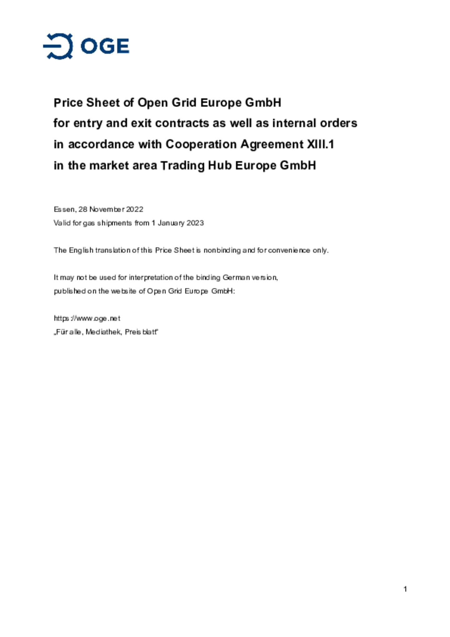 Price Sheet of Open Grid Europe GmbH for entry and exit contracts as well as internal orders in accordance with Cooperation Agreement XIII.1 in the market area Trading Hub Europe GmbH