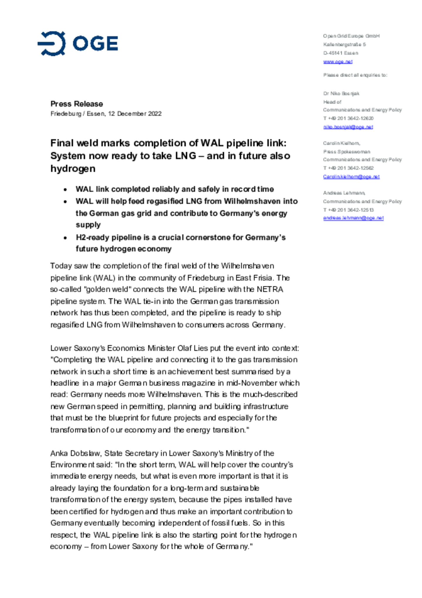 WAL link completed reliably and safely in record time. WAL will help feed regasified LNG from Wilhelmshaven into the German gas grid and contribute to Germany's energy supply. H2-ready pipeline is a …crucial cornerstone for Germany’s future hydrogen economy.