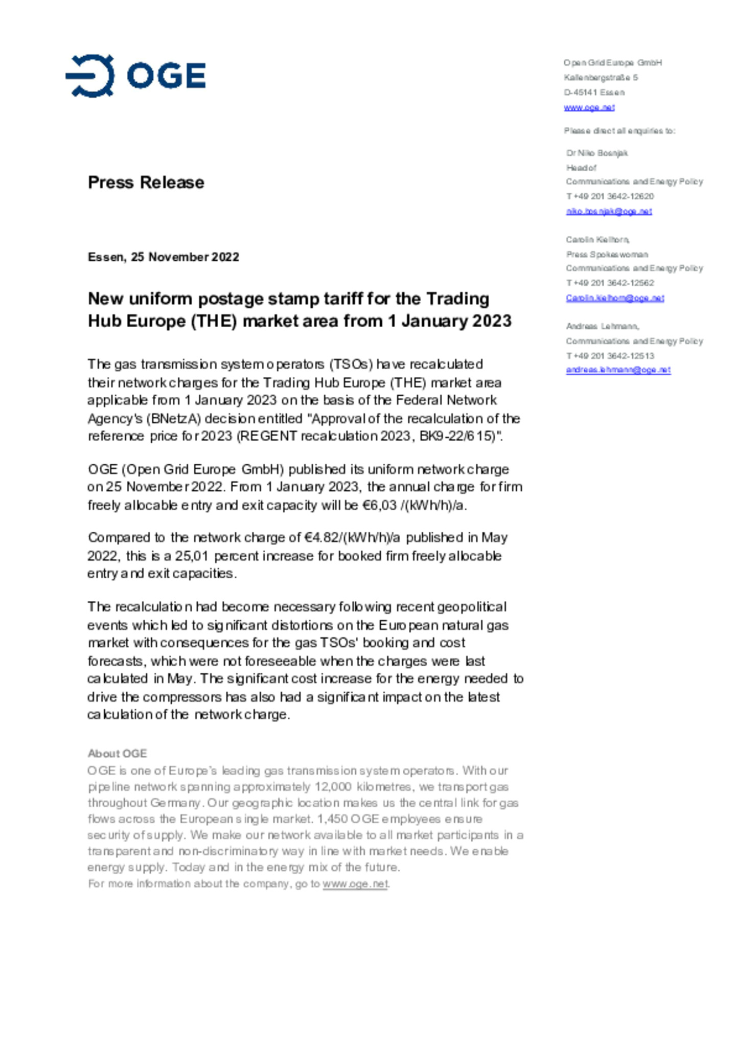 The gas transmission system operators (TSOs) have recalculated their network charges for the Trading Hub Europe (THE) market area applicable from 1 January 2023 on the basis of the Federal Network …Agency's (BNetzA) decision entitled "Approval of the recalculation of the reference price for 2023 (REGENT recalculation 2023, BK9-22/615)".