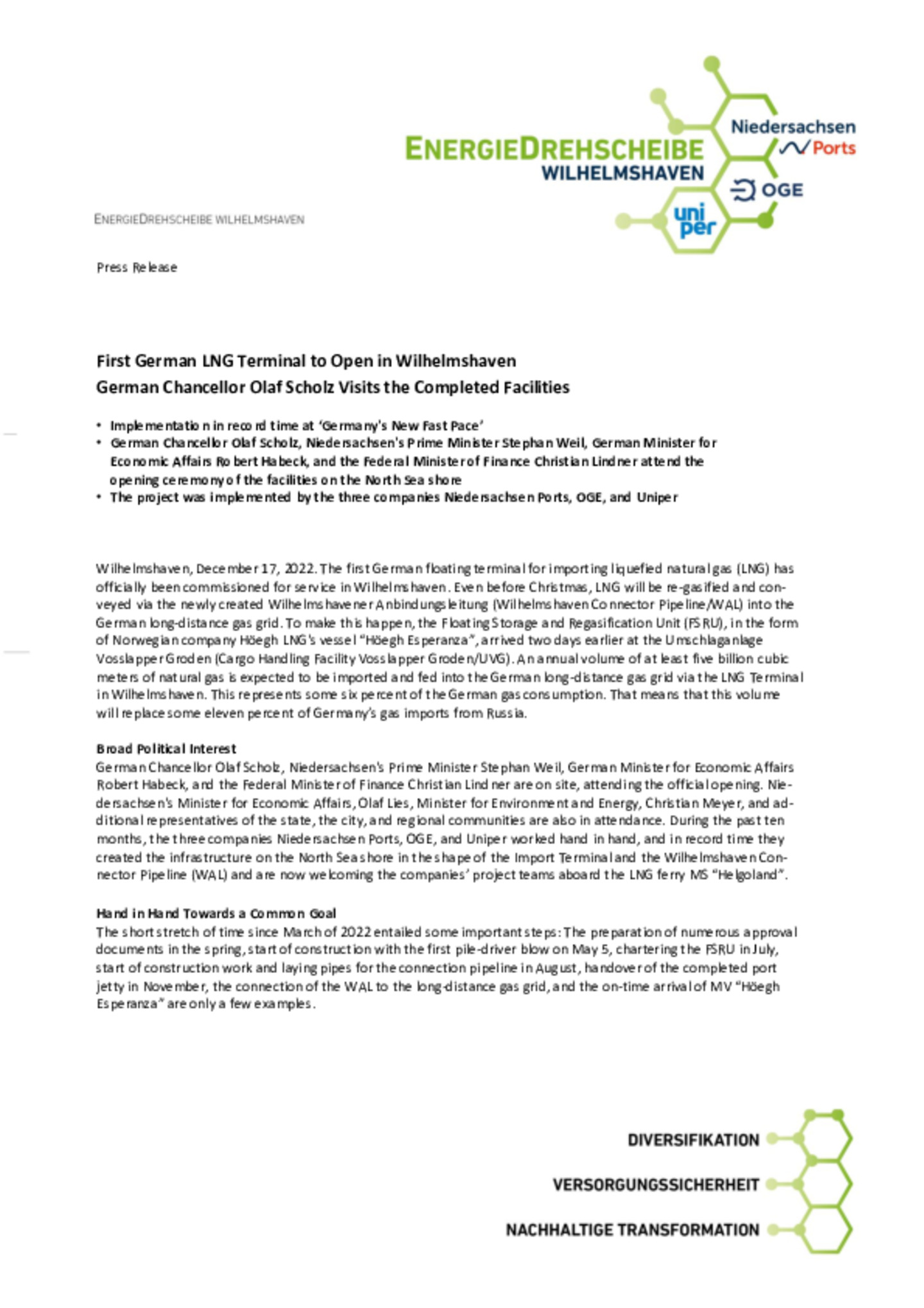Implementation in record time at ‘Germany's New Fast Pace’. German Chancellor Olaf Scholz, Niedersachsen's Prime Minister Stephan Weil, German Minister for Economic Affairs Robert Habeck, and the …Federal Minister of Finance Christian Lindner attend the opening ceremony of the facilities on the North Sea shore. The project was implemented by the three companies Niedersachsen Ports, OGE, and Uniper.