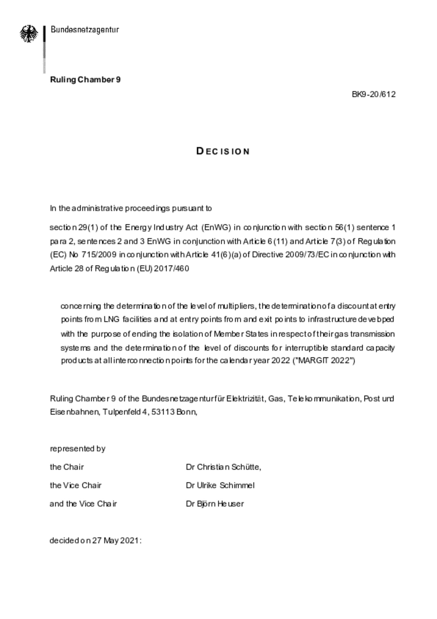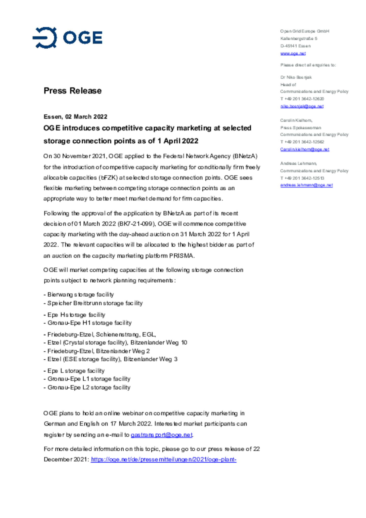 On 30 November 2021, OGE applied to the Federal Network Agency (BNetzA) for the introduction of competitive capacity marketing for conditionally firm freely allocable capacities (bFZK) at selected …storage connection points.