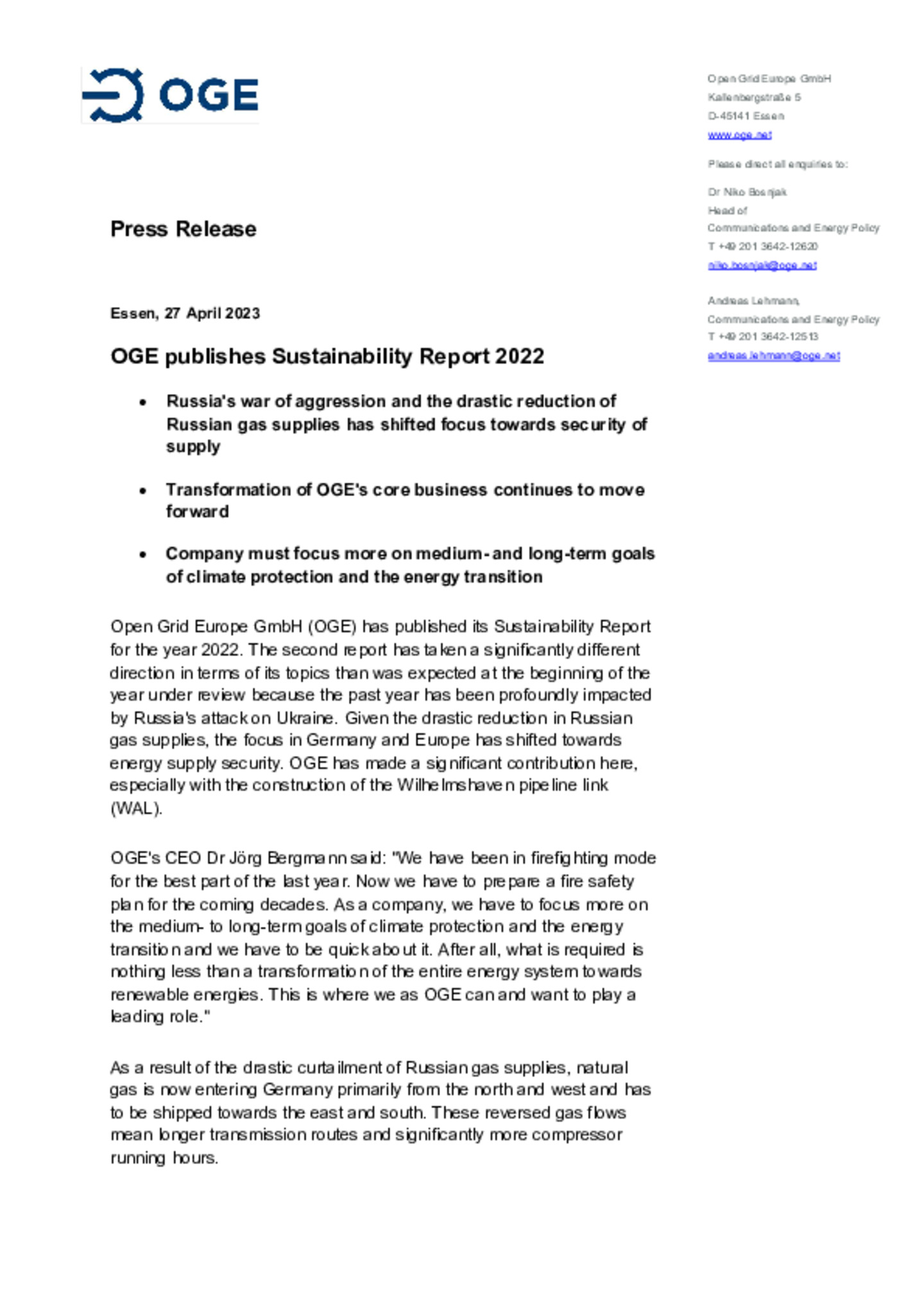 Russia's war of aggression and the drastic reduction of Russian gas supplies has shifted focus towards security of supply. Transformation of OGE's core business continues to move forward. Company must focus more on medium- and long-term goals of climate protection and the energy transition.