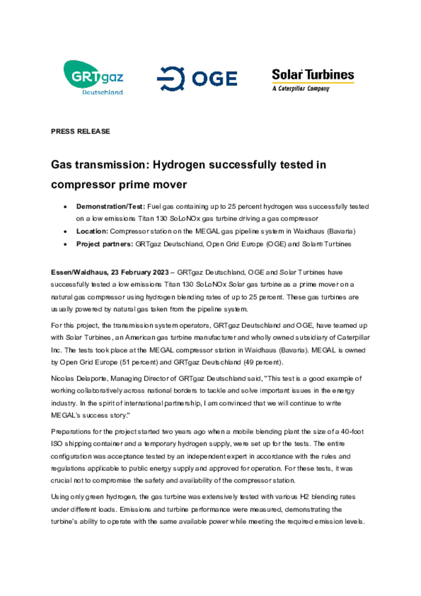 GRTgaz Deutschland, OGE and Solar Turbines have successfully tested a low emissions Solar gas turbine as a prime mover on a natural gas compressor using hydrogen blending rates of up to 25 percent.