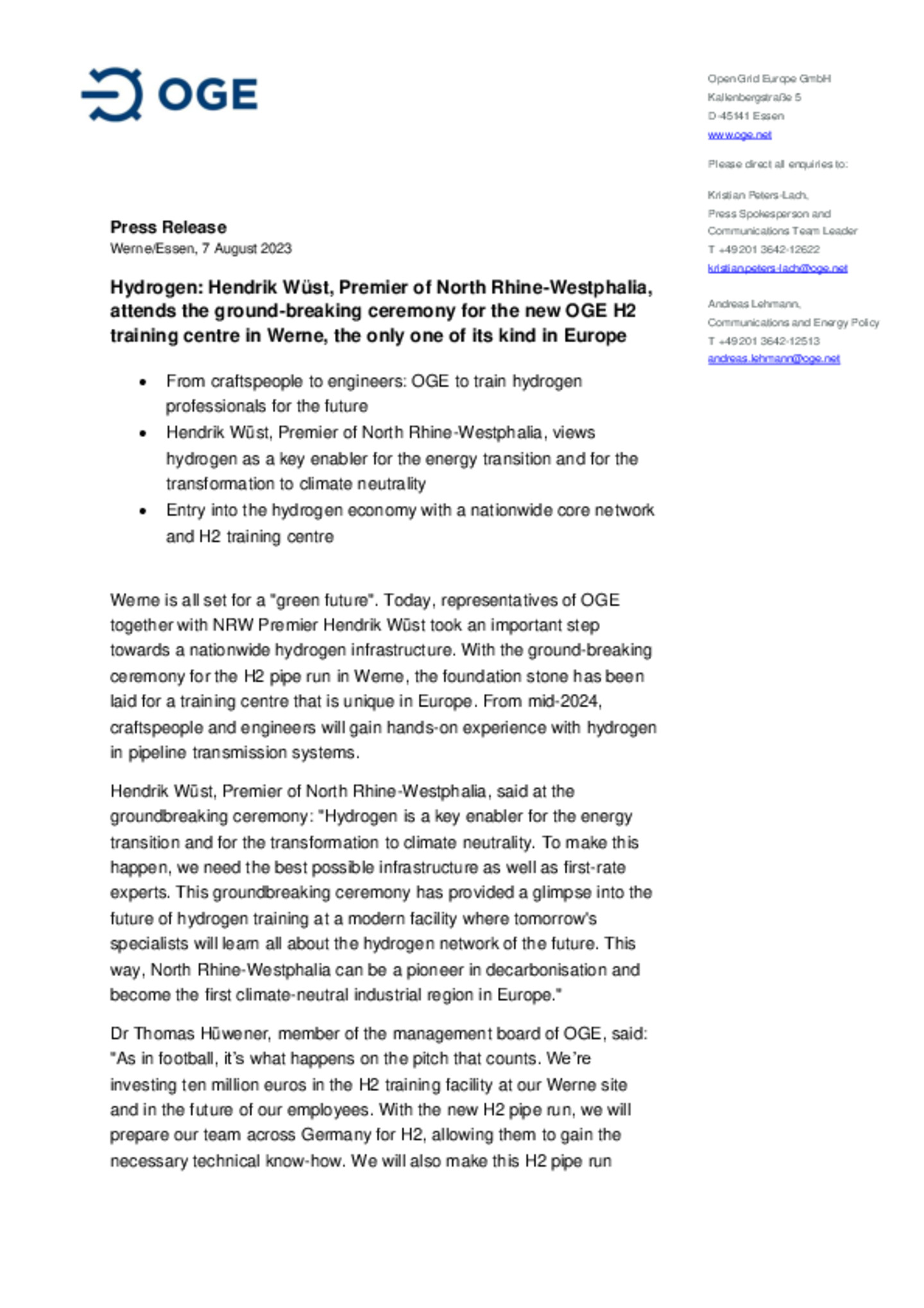 Hydrogen: Hendrik Wüst, Premier of North Rhine-Westphalia, attends the ground-breaking ceremony for the new OGE H2 training centre in Werne, the only one of its kind in Europe. From craftspeople to engineers: OGE to train hydrogen professionals for the future. Hendrik Wüst, Premier of North Rhine-Westphalia, views hydrogen as a key enabler for the energy transition and for the transformation to climate neutrality. Entry into the hydrogen economy with a nationwide core network and H2 training centre.