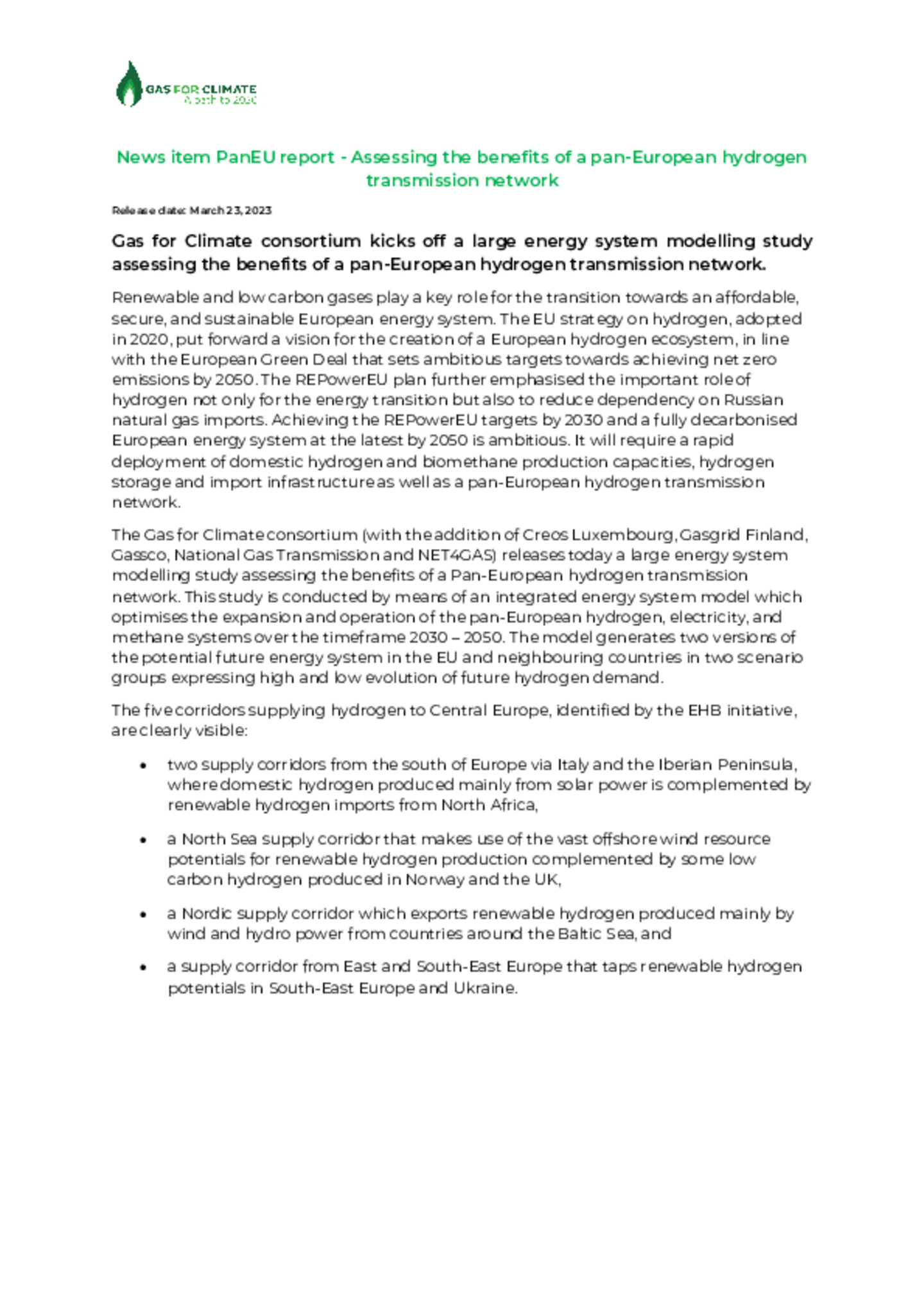 PanEU report – Assessing the benefits of a pan-European hydrogen transmission network