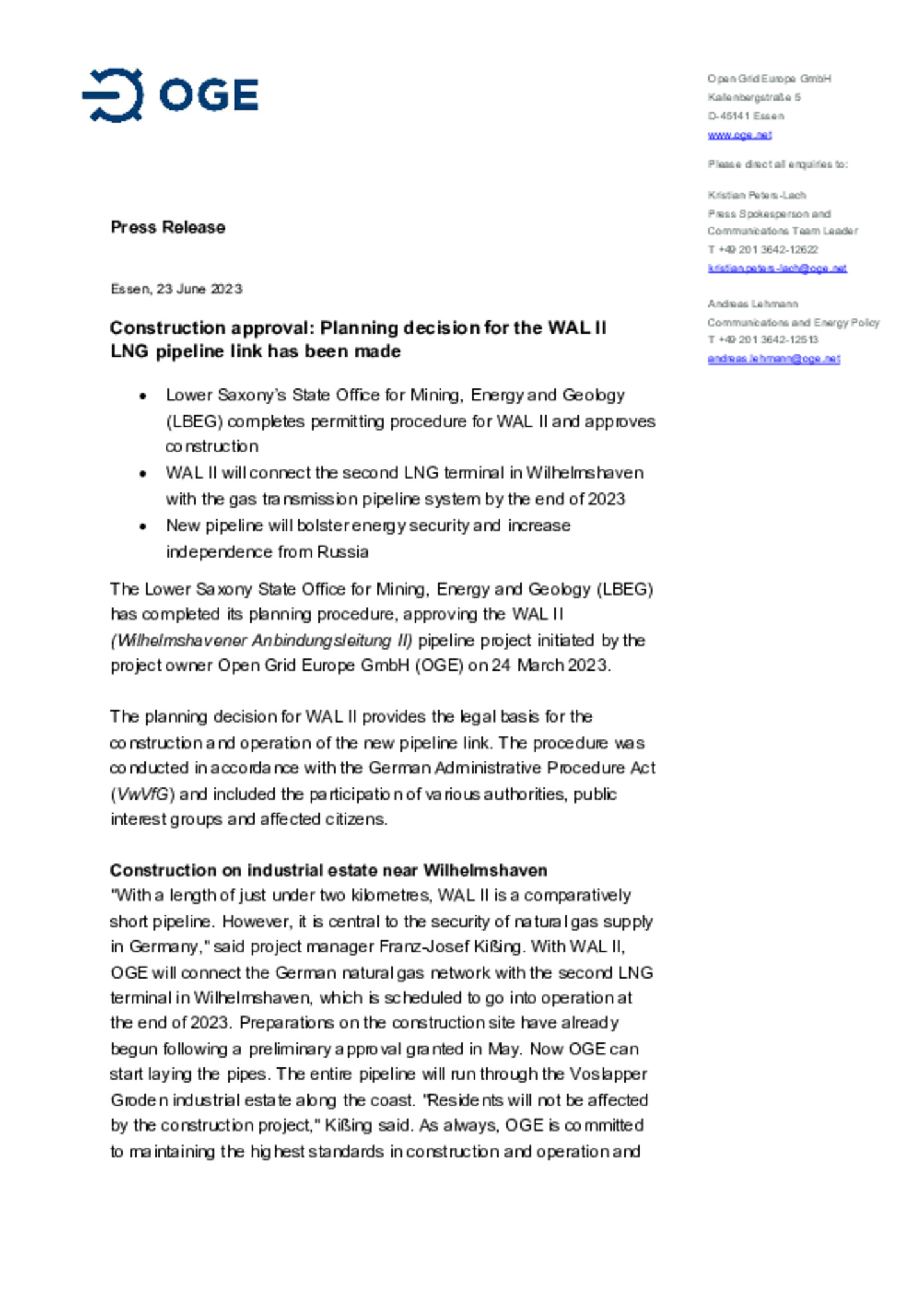 Lower Saxony’s State Office for Mining, Energy and Geology (LBEG) completes permitting procedure for WAL II and approves construction. WAL II will connect the second LNG terminal in Wilhelmshaven with the gas transmission pipeline system by the end of 2023. New pipeline will bolster energy security and increase independence from Russia.