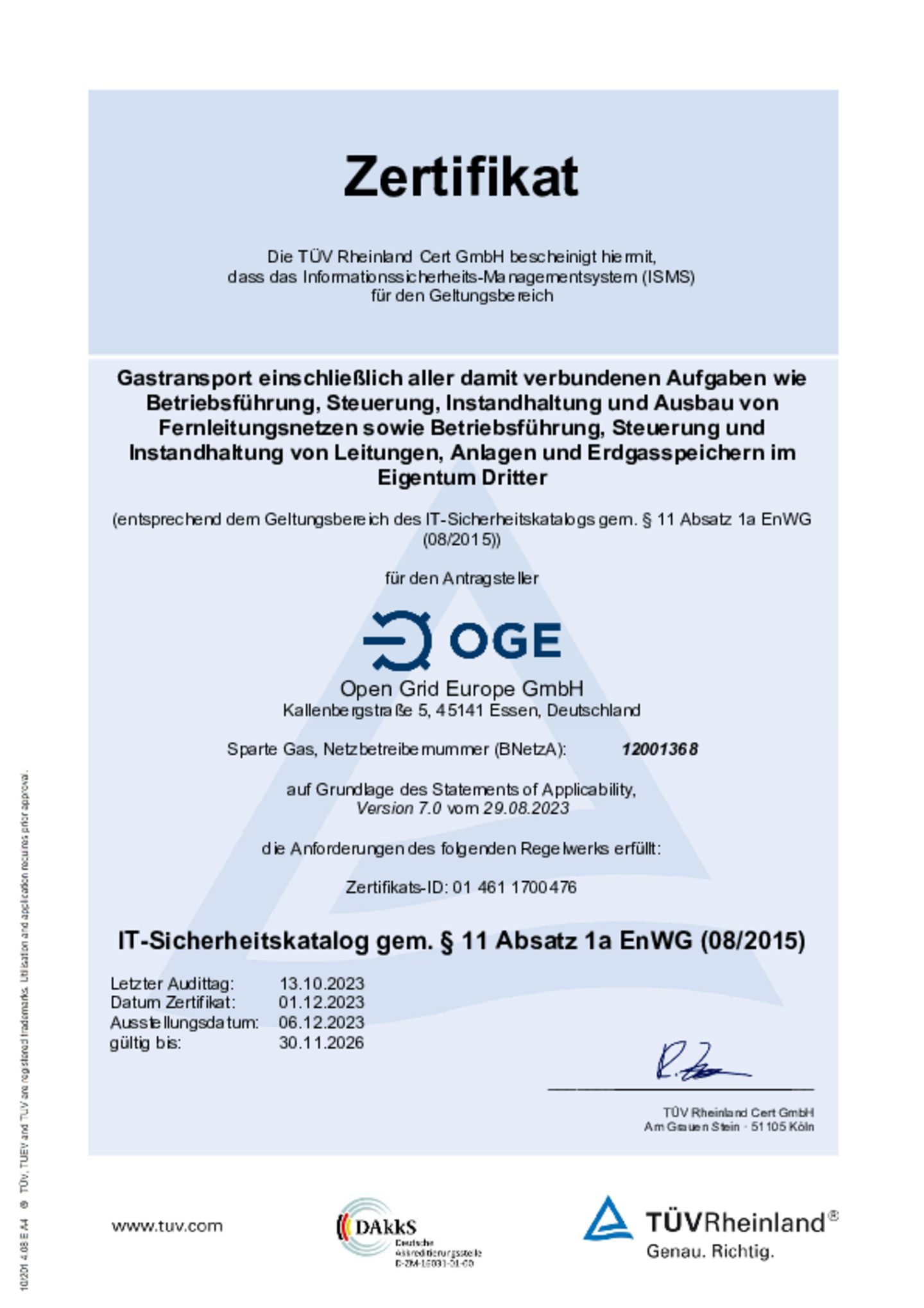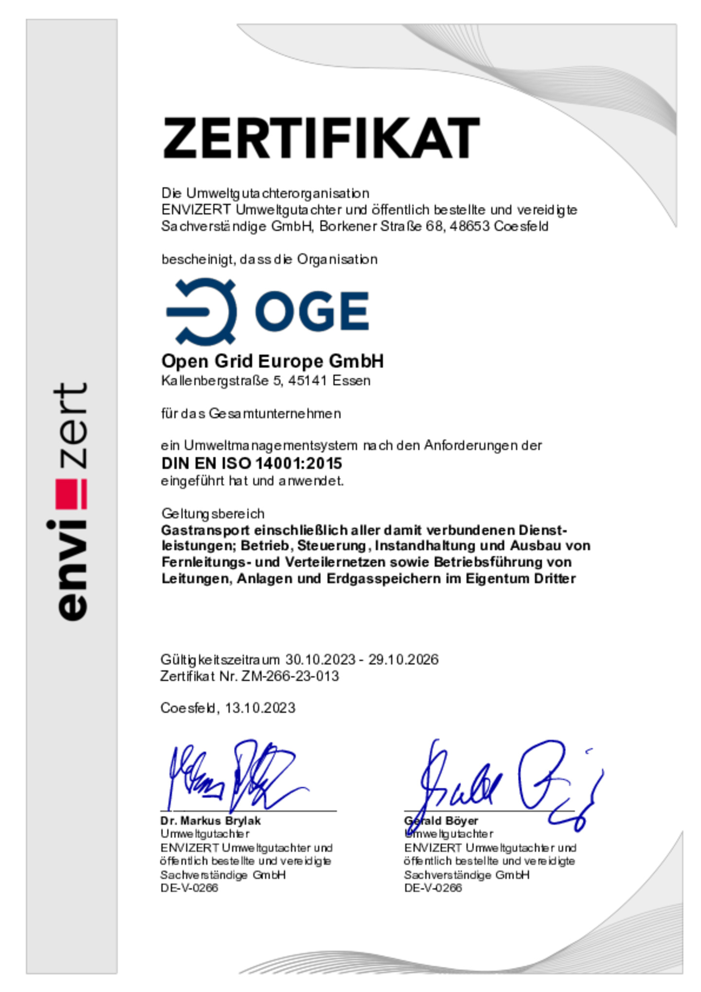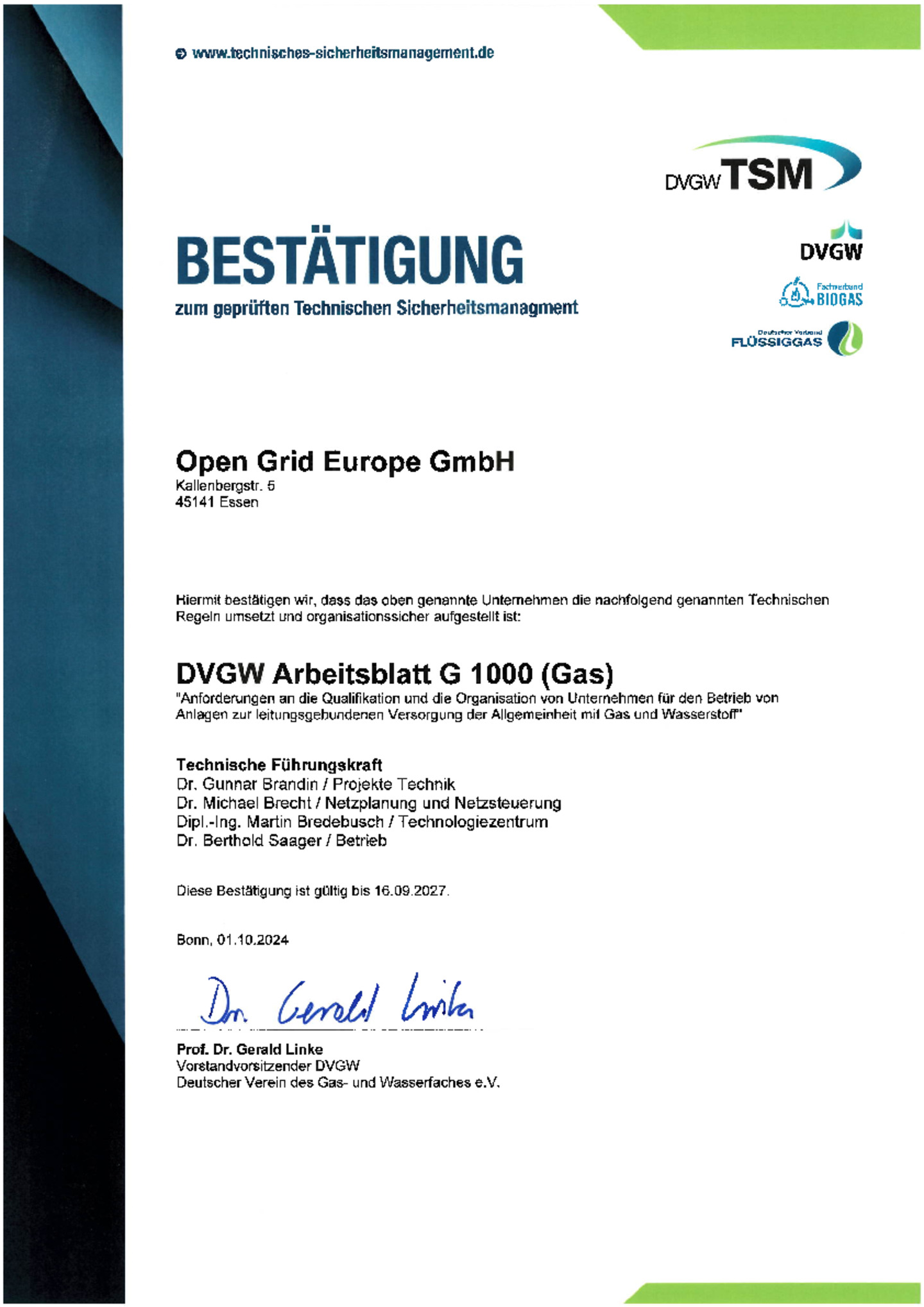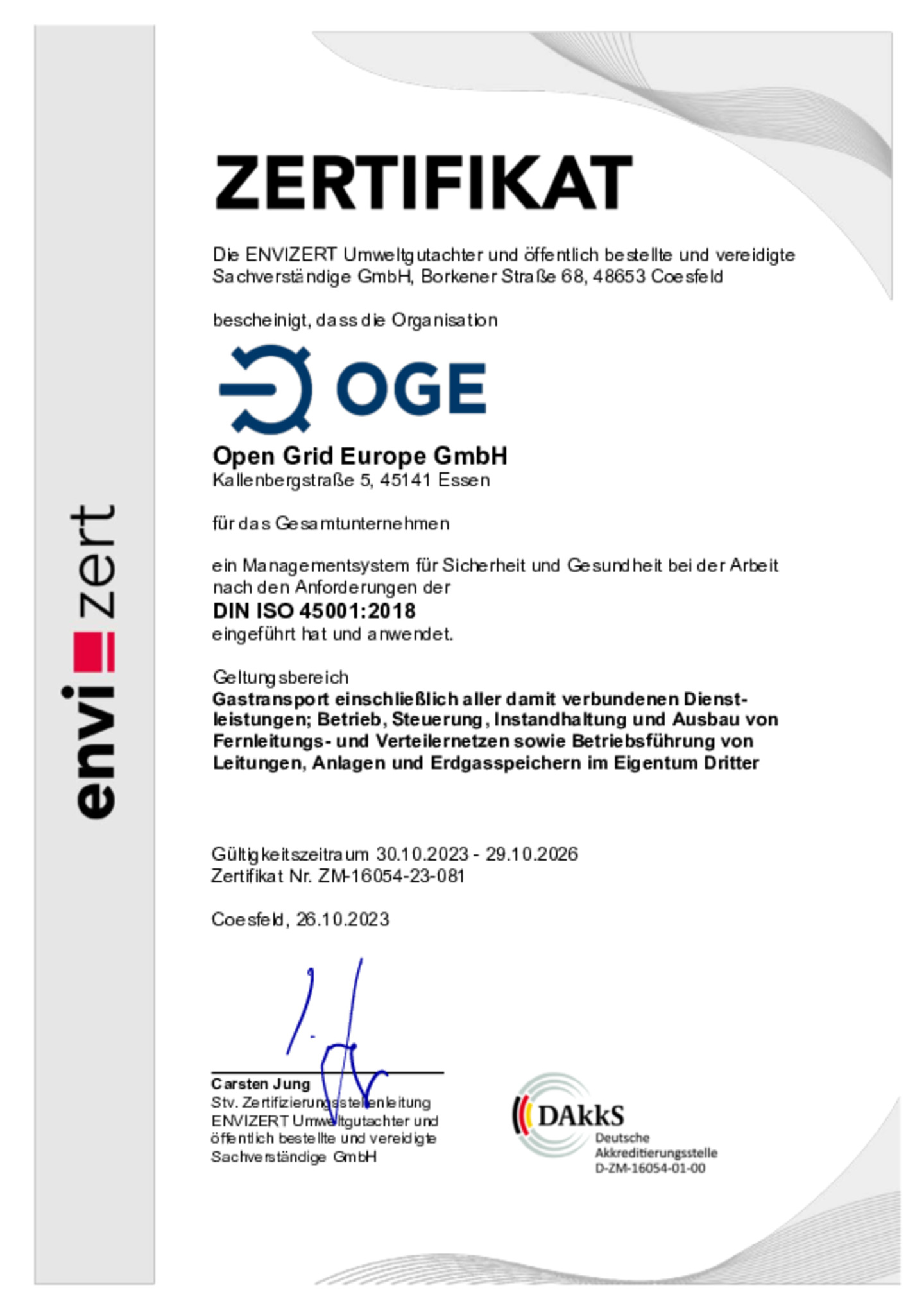 The certificates awarded to OGE confirm that our integrated QSE system meets all the requirements arising from legislation and applicable technical codes and standards, including DIN EN ISO 9001 for quality, DVGW Code of Practise G 1000 for technical safety management, the DIN ISO 45001 for health and safety, as well as DIN EN ISO 50001 for energy efficiency and DIN EN ISO 14001 for environmental matters.